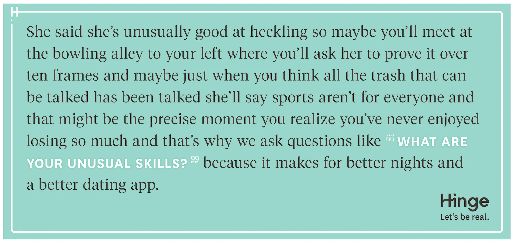 THE DATING APP WORLD CAN BE BRUTAL, AND IN AN AGE WHERE WE'RE ALL MAKING REALLY INFORMED DECISIONS, WHERE WE RESEARCH THE BEST TACO FOR 3 HOURS BEFORE WE DECIDE WHERE TO GO, WE ARE STILL SO FRIVOLOUS ON DATING APPS, JUDGING PEOPLE ONLY BY HOW THEY LOOK AND SWIPING PAST PEOPLE THAT COULD BE SOMEONE WE'D LIKE TO MEET. ENTER: HINGE. HINGE IS WHERE PEOPLE ARE MORE THEMSELVES THAN ANYWHERE ELSE. THEY'VE REBUILT THEIR APP SO PEOPLE ARE PROMPTED TO REVEAL A BIT MORE ABOUT THEMSELVES IN ORDER TO FIND SOMETHING REAL.